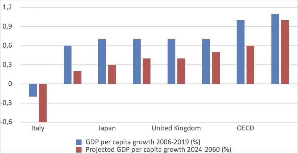 La crescita del PIL pro capite dell’Italia è stata tra le più basse nel periodo 2006-2019 e sarà ancora più debole nel 2024-2060 a causa dell’invecchiamento della popolazione e del forte calo dei 15-64 anni (-21%), che ridurrà la forza lavoro e l’occupazione. Meno lavoratori significa minore capacità di crescita economica nel lungo periodo. Al contrario, paesi come gli USA e quelli OCSE mostrano prospettive di crescita più solide.