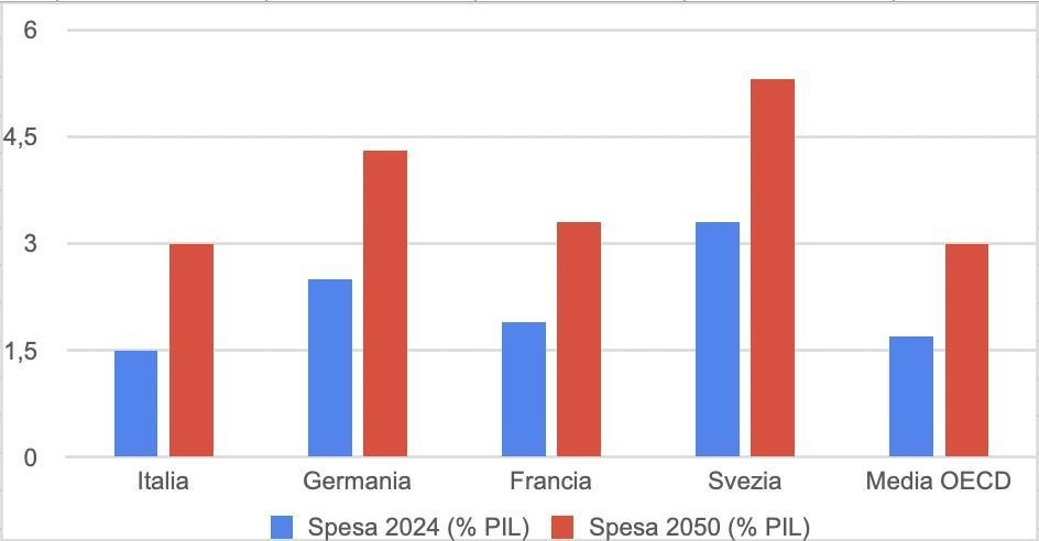 L’invecchiamento della popolazione farà aumentare fortemente la spesa pubblica per l’assistenza a lungo termine (LTC), passando da circa l’1,5% del PIL nel 2024 a circa il 3% nel 2050. In Italia, nel 2050, la spesa per le LTC peserà tra il 2,5% e il 3,2% del PIL, mettendo sotto pressione i conti pubblici.